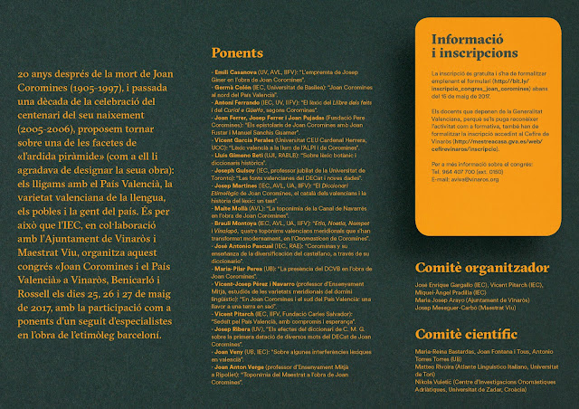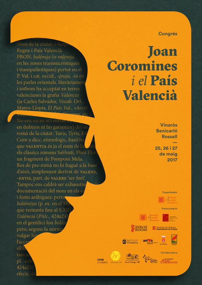 Els dies 25, 26 i 27 de maig dinou estudiosos de reconeguda trajectòria en l’àmbit de la lingüística i de la filologia analitzaran des de diferents perspectives l’aportació valenciana del lingüista i etimòleg Joan Coromines (1905-1997) en el Congrés “Joan Coromines i el País Valencià”, que se celebrarà a Vinaròs i a Rossell.