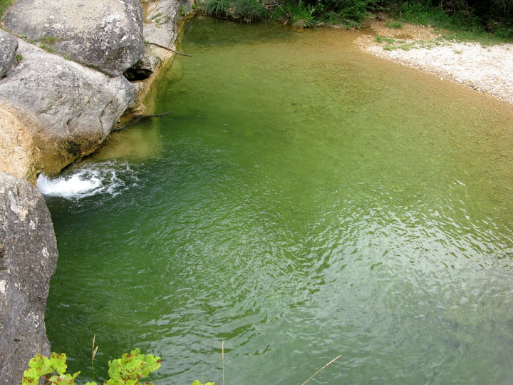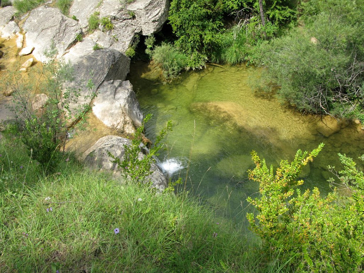 Descripción: A nuestra izquierda encontraremos un palo que nos indica el sendero a seguir. Este sendero, hoy bastante estropeado debido a su aprovechamiento para descender troncos cortados, sube bastante fuerte por un terreno rocoso, formado por roca conglomerada, similar al existente a Montserrat y otros macizos sedimentarios de Cataluña. Al final de la subida encontramos una alambrada que tendremos que siempre paralelas en el torrente siguiendo la alambrada que nos queda a nuestra derecha, hasta donde podemos ver el primer gran salto de agua, el Pozo de la Cabaña.