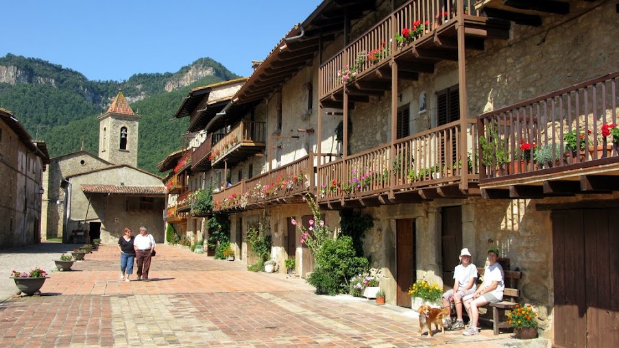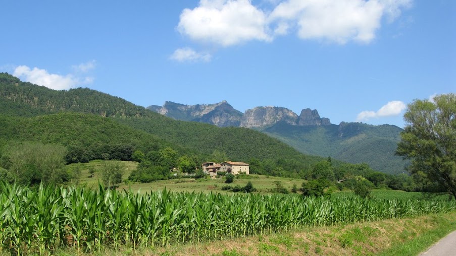 Antes de comenzar el itinerario, tenemos la fortuna de visitar Els Hostalets d’en Bas y hacer un poco de turismo por la zona. Ni que decir tiene que es altamente recomendable hacerlo, mirad las fotos que lo dicen todo. De camino a Sant Privat d’en Bas, pasamos delante de la ermita de Sant Quinti, que con el paisaje de fondo de las cingleras de la Vall d’en Bas, forman un cuadro de postal. Iniciamos el itinerario en Sant Privat d’en Bas.