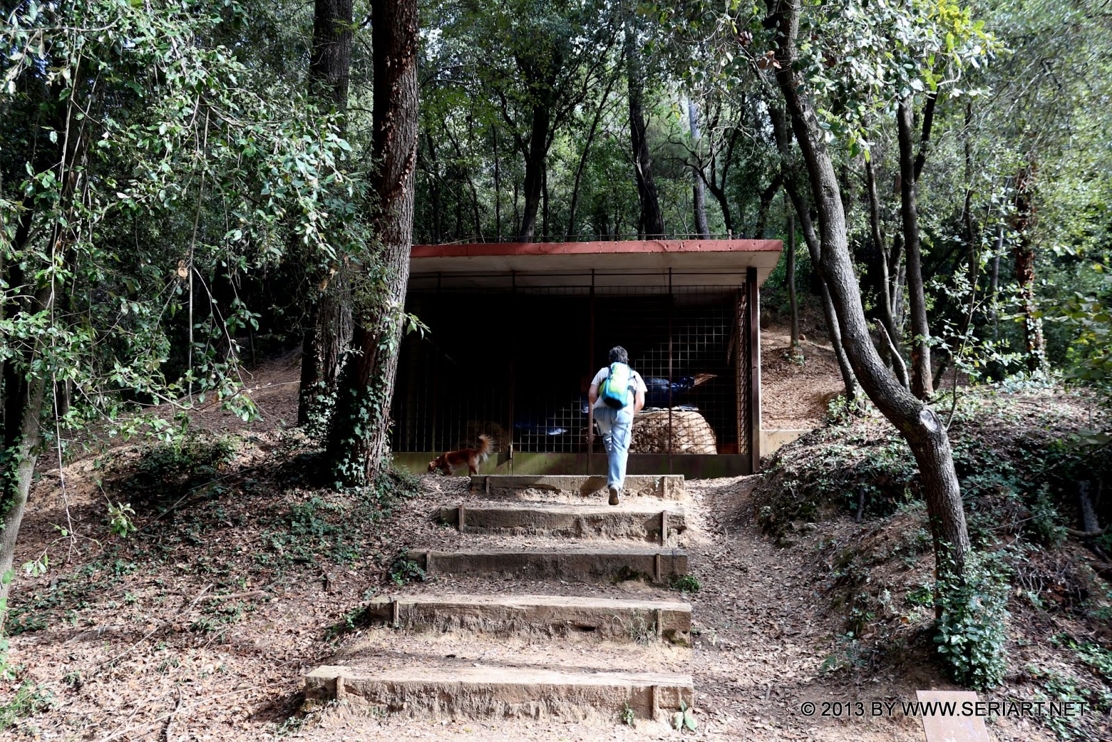 Se sigue en dirección sur bordeando el arroyo de Sant Medir por su derecha. En seguida, a los 5 minutos, se deja la pista principal y se toma un desvío a la izquierda que pasa la riera y, en 150 metros, lleva a la ermita de Sant Adjutori y a los restos prehistóricos de un remoto horno ibero. Se vuelve atrás, se prosigue por el camino principal y se remonta hasta encontrar un arroyo, que a partir de ahora se cruzará cuatro veces.
