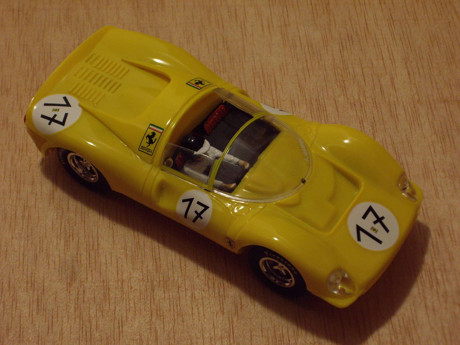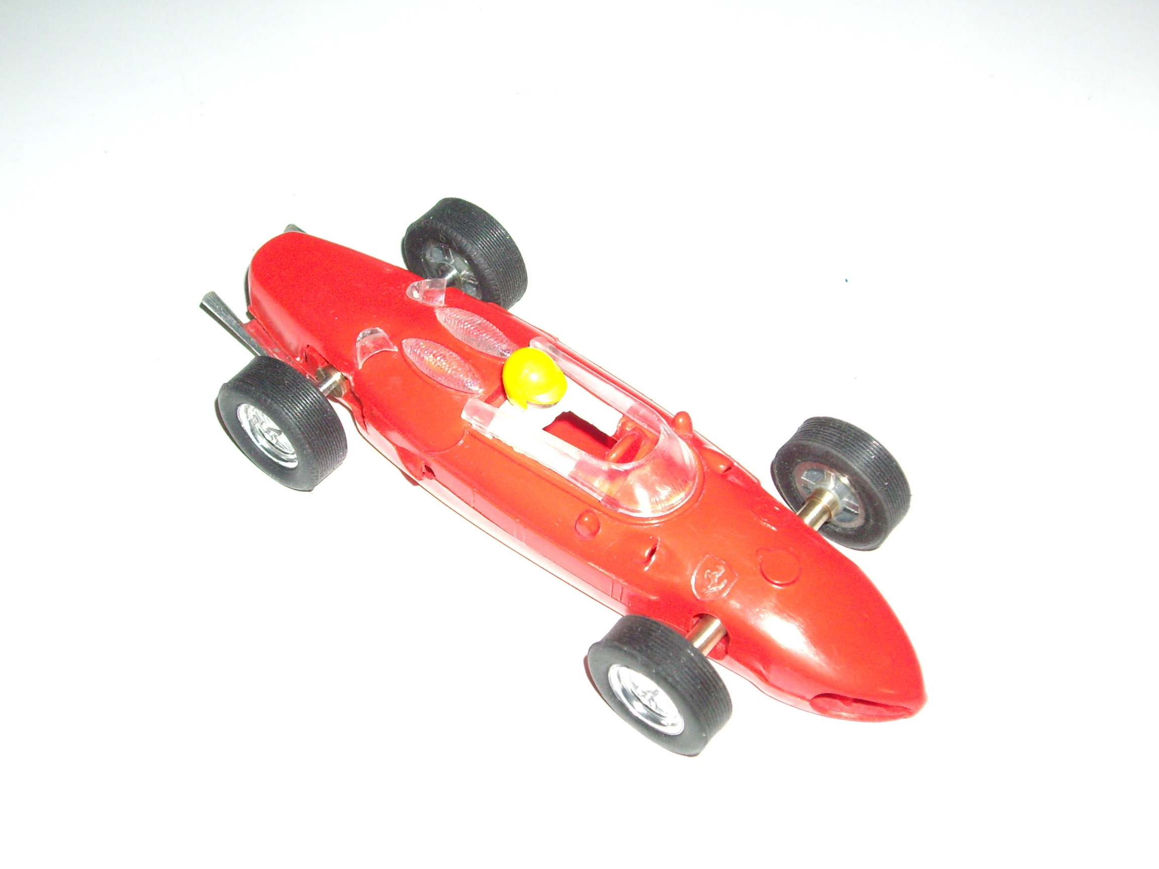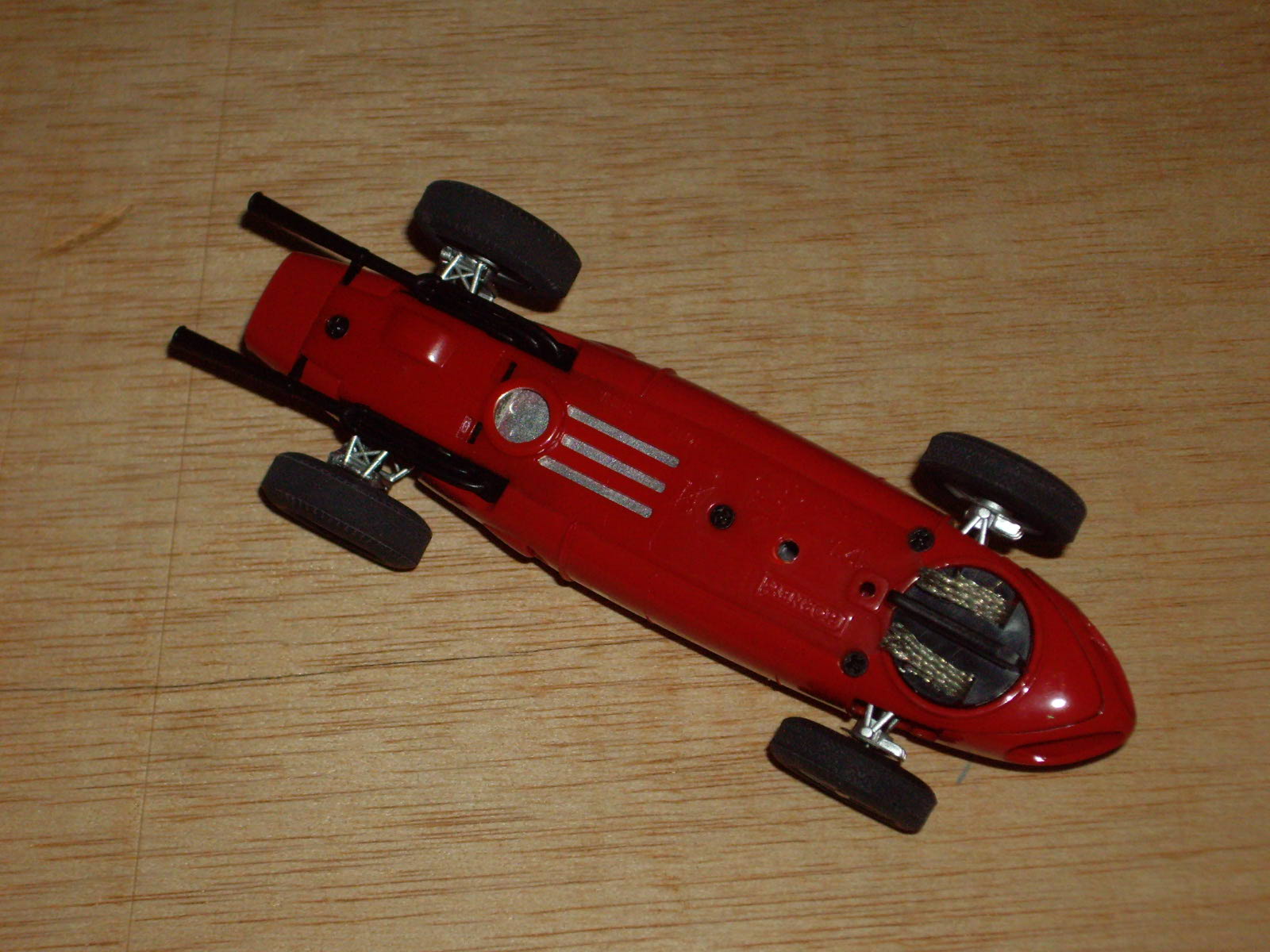 Carrosseria: té un bon aspecte general, amb les formes força ben assolides. S'intueix en alguns punts errors d'escala, sobretot pel que fa al lateral, que sembla més baix del que és en realitat. Els llums i cromats fan el fet. Pot ser el neteja parabrises i els tubs d'escapament tenen un aspecte excessivament de joguina. Les nombroses obertures que hi ha al llarg del frontal i lateral, estan ben practicades i perfilades, però a la part posterior, darrera del pas de roda hi ha una que només està simulada. Al mercat es podia trobar en diversos colors, dos en vermell, clar i fosc, verd, grog, blau marí i platejat, però s'han fet algunes edicions especials de fires i competicions amb tirades molt limitades. El tipus de decoració varia segons el model: en els primers és a base d'enganxines, tant dels dorsals com els escuts, les matricules, etc., mentre que en models posteriors ja apareix la tampografia. La safata del pilot és molt austera, d'un sol color i amb relleu dels seients, el volant i la palanca de canvis. El pilot és d'un sol color, o blanc o blau cel, amb un casc que intenta ser una reproducció de l'estimat tipus jet d'EXIN, però sense pintar les ulleres del pilot. Destaca la gran lleugeresa del conjunt. La carrosseria es fixa al xassís mitjançant un únic cargol tipus Phillips negre o galvanitzat, situat a la part posterior, just entre els dos tubs d'escapament. En els models tampografiats, la carrosseria està pintada, però en els altres, el color el dona el mateix color del butirat, com passava en els antic cotxes d'EXIN.