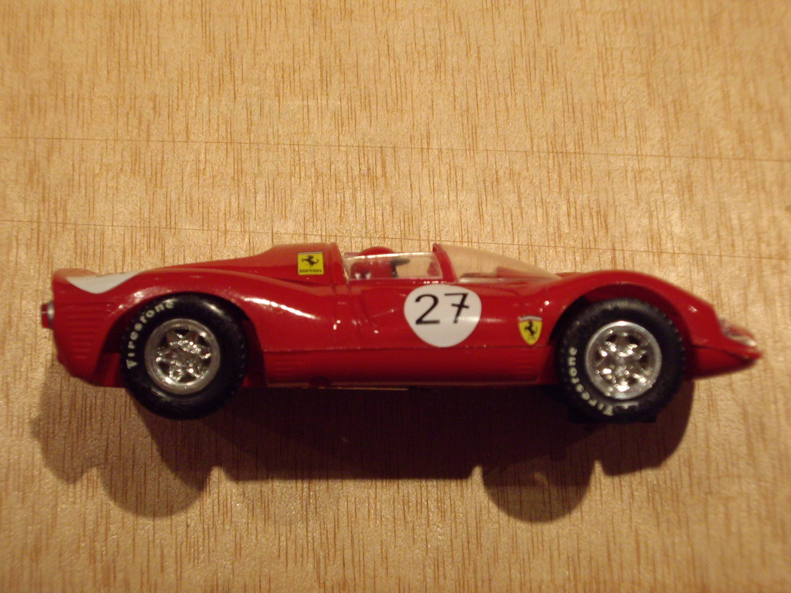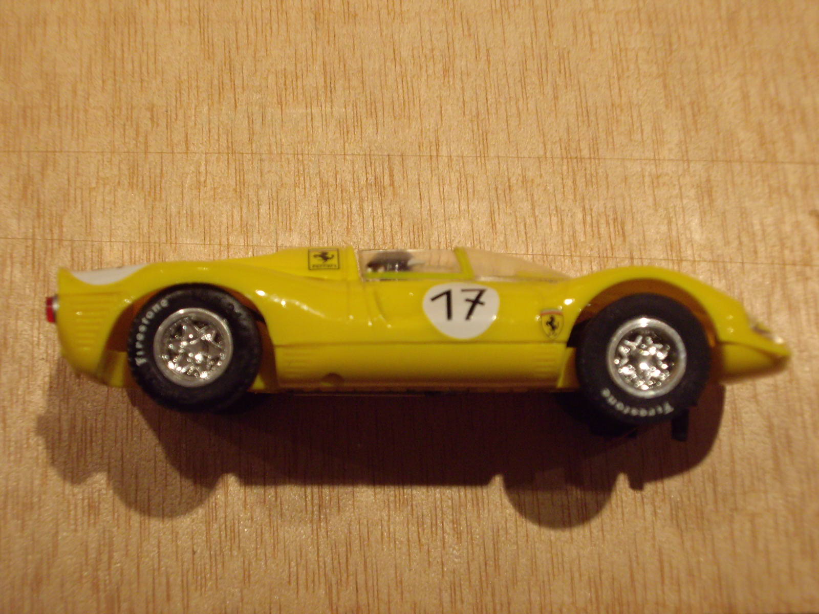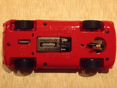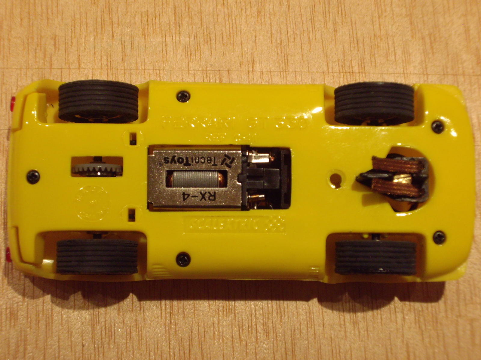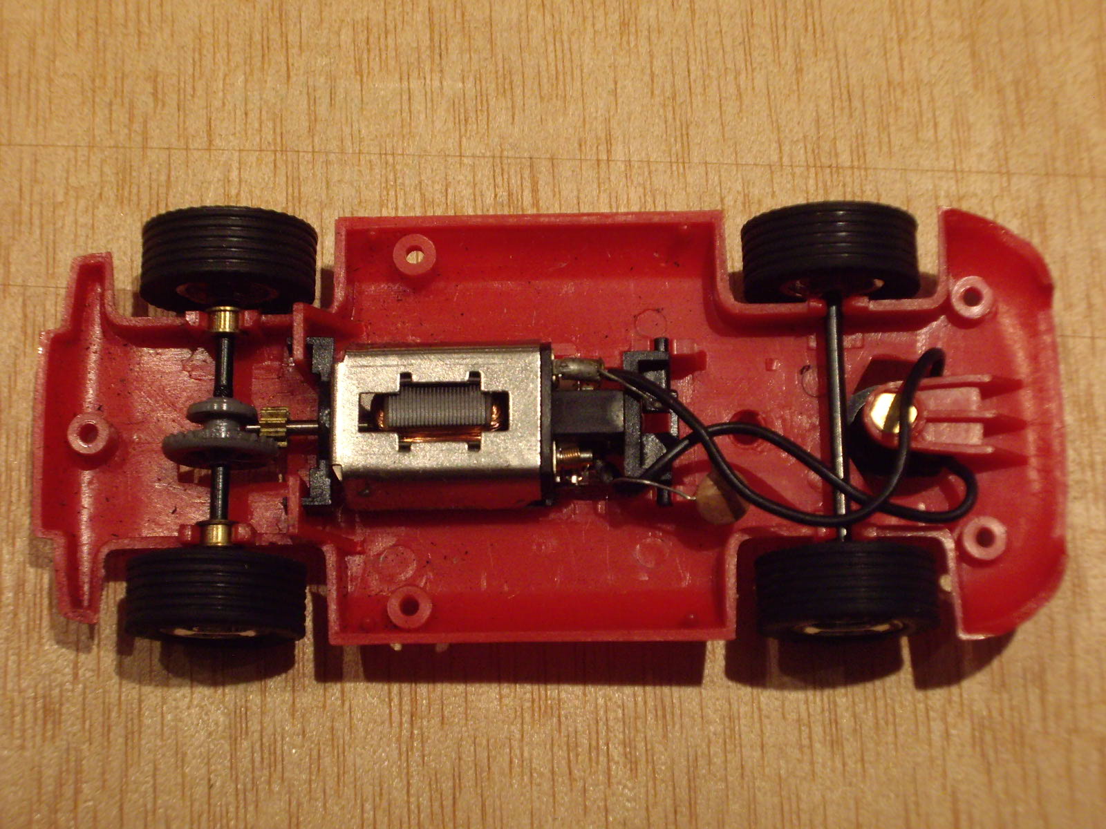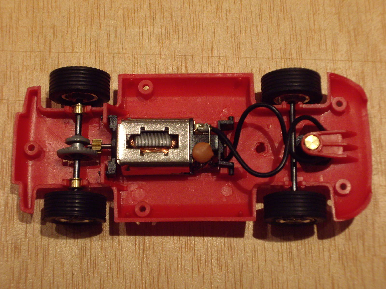 Parts mecàniques: com he comentat es munten dos tipus de motor, l'un de 12.000 rpm i l'altre de 15.000, tenint tots dos nou dents i pinyó de bronze. El de 12.000 és clarament insuficient per moure amb alegria el cotxe tot i la seva lleugeresa, quedant pràcticament per a passejar, a la vegada que a mida que s'escalfa va perdent potència. La corona, que és de plàstic blau o negre, te 27 dents. Els coixinets de l'eix posterior són també de bronze. L'eix anterior té un desplaçament vertical excessiu sota el meu punt de vista. Les llandes no es pot dir que siguin el fort de la peça, ja que tot i que són de radis, aquests estan massa separats entre ells. Una cosa que sí que està encertada a les llandes és que les posteriors tenen els radis més ensorrats, cosa que dona la sensació que és més ample, tot i muntar la mateixa amplada de pneumàtic. La guia és a pressió, sense auto centrat ni suspensió. Els cables que connecten el motor i la guia, tenen una rigidesa semblant a la silicona, cosa d'agraïr en un model tant bàsic i no dedicat a la competició. Les gomes, les quatre iguales, tenen una certa duresa, però que ajuda a que el cotxe no volqui per culpar de l'estretor de vies. Tot i així, el lateral el tenen lleugerament treballat, donant una imatge força real.