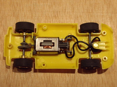 Xassís: hi ha dos versions, que únicament es diferencien pel tipus de motor que hi porten adaptat. La primera que va sortir al mercat és la que permet col·locar-hi un motor obert tipus Triang. Evidentment no és aquest el que porta, si no un Mabuchi de caixa plana de 12.000 rpm amb un allargador de pinyó per a poder arribar a on es troba el pla rotacional de la corona. Com que el motor per sí mateix no es pot adaptar a les fixacions tipus Triang, s'incorpora una safata adaptadora que fa de pont entre motor i xassís, com es pot veure a la següent fotografia.