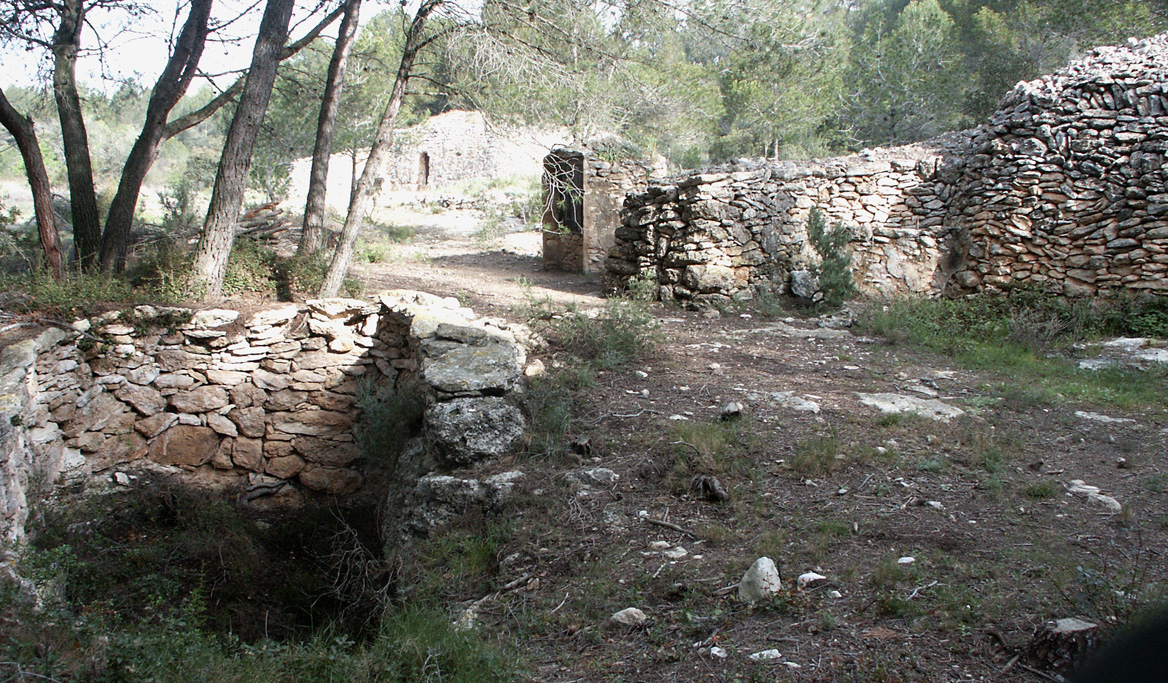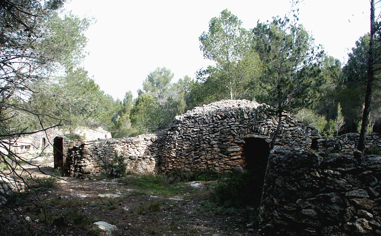 Aquesta gran barraca de cúpula coronada amb porta en arc de mig punt queda ben amagada per les ombres i penombres dels pins del bosc, com si la volgués preservar de les mirades de la gent, guardar-la només pels pocs essers que l’habiten .