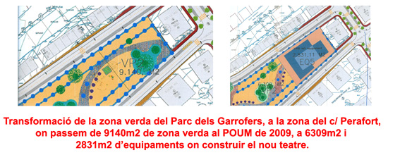 Ara bé aquests 2831 m2 de jardins que perdem aquí els hem de recuperar en un altre lloc: Al costat de la Plaça de la Generalitat, entre els carrers Gaudí i riu Tulcis. Abans d’aprovar-se el POUM, 20 gener de 2009, aquest espai comptava amb uns equipaments públics de 7831m2, l’espai necessari per a construir un col·legi de dues línies o una residencia d’avis, per exemple.